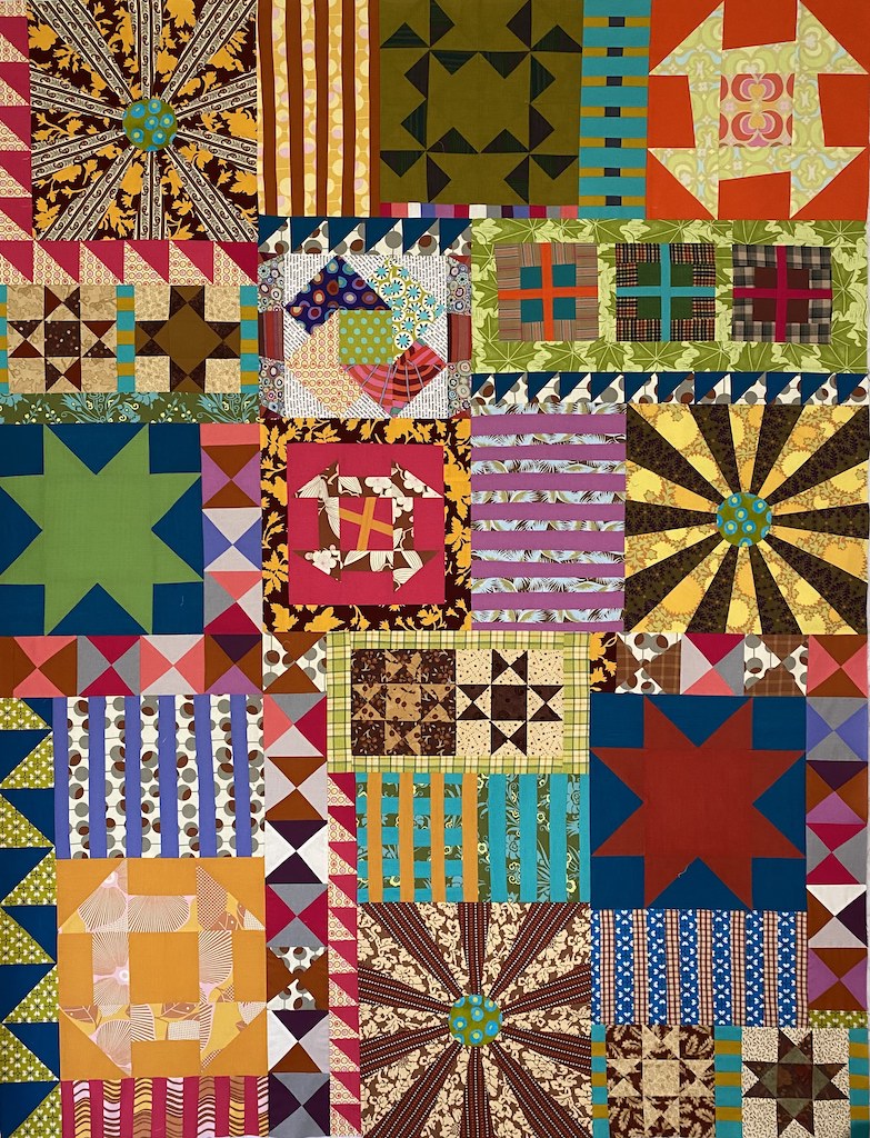 Wall of Sound explores the traditional quilt block Crossed Square using hand dyed fabrics, vintage, and contemporary cotton textiles. Many of the prints used in the quilt are pieced prints. The quilt celebrates almost a hundred years in fabric--with prints from as far in the past as the 1930s.