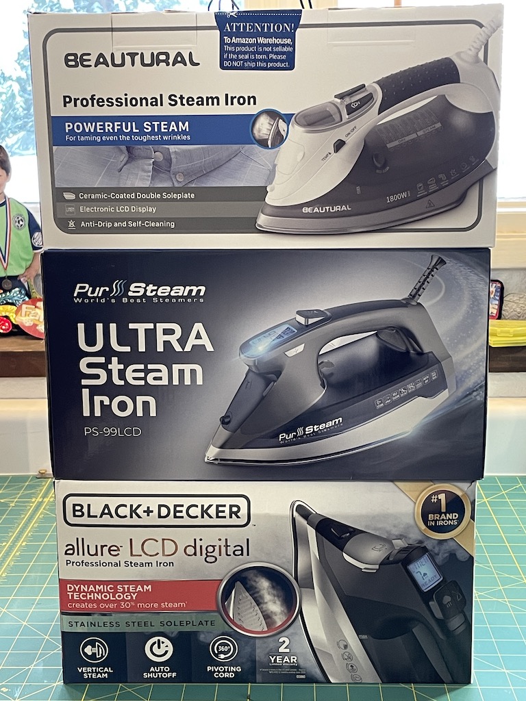 STUDIO SNAPSHOT I am having a crisis of faith when it comes to my iron. My beloved Beautural Iron has lost its magic. The first one lasted 2 1/2 years, which is a record. The second one lasted a week, and the third one just died. I ordered three irons to try out. I hope one of these guys really gets hot, steams a lot, and lasts forever! |