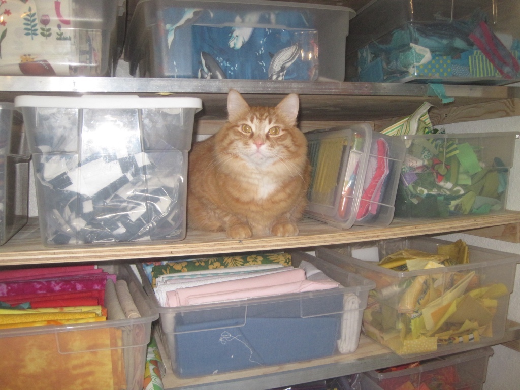 My studio is in the center of our house, and somehow everyone manages to find a space to hunker down. This is Kato. It is hard to believe that we have had this crazy cat for twelve years! When I am on the road, I have to be careful to put away all my fabric. If I don’t, it will be covered in orange fur when I get home.
