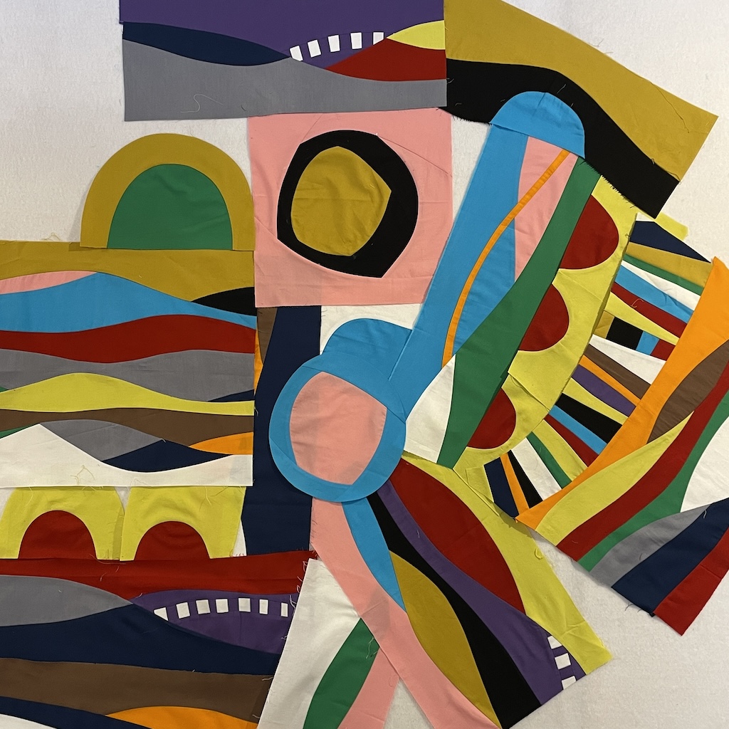 I always bring a twelve color palette on my teaching trips to use for demo-ing and maybe even a quilt! Here are the parts I have stitched over the last few months. Keep in mind that this is an inventory not a composition (yet).